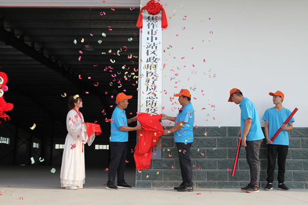 云臺山醫(yī)藥公司法律顧問張海、云臺山醫(yī)藥公司市場四部經理萬英武為焦作市中站區(qū)政府醫(yī)療應急防疫物資儲備庫揭牌;
